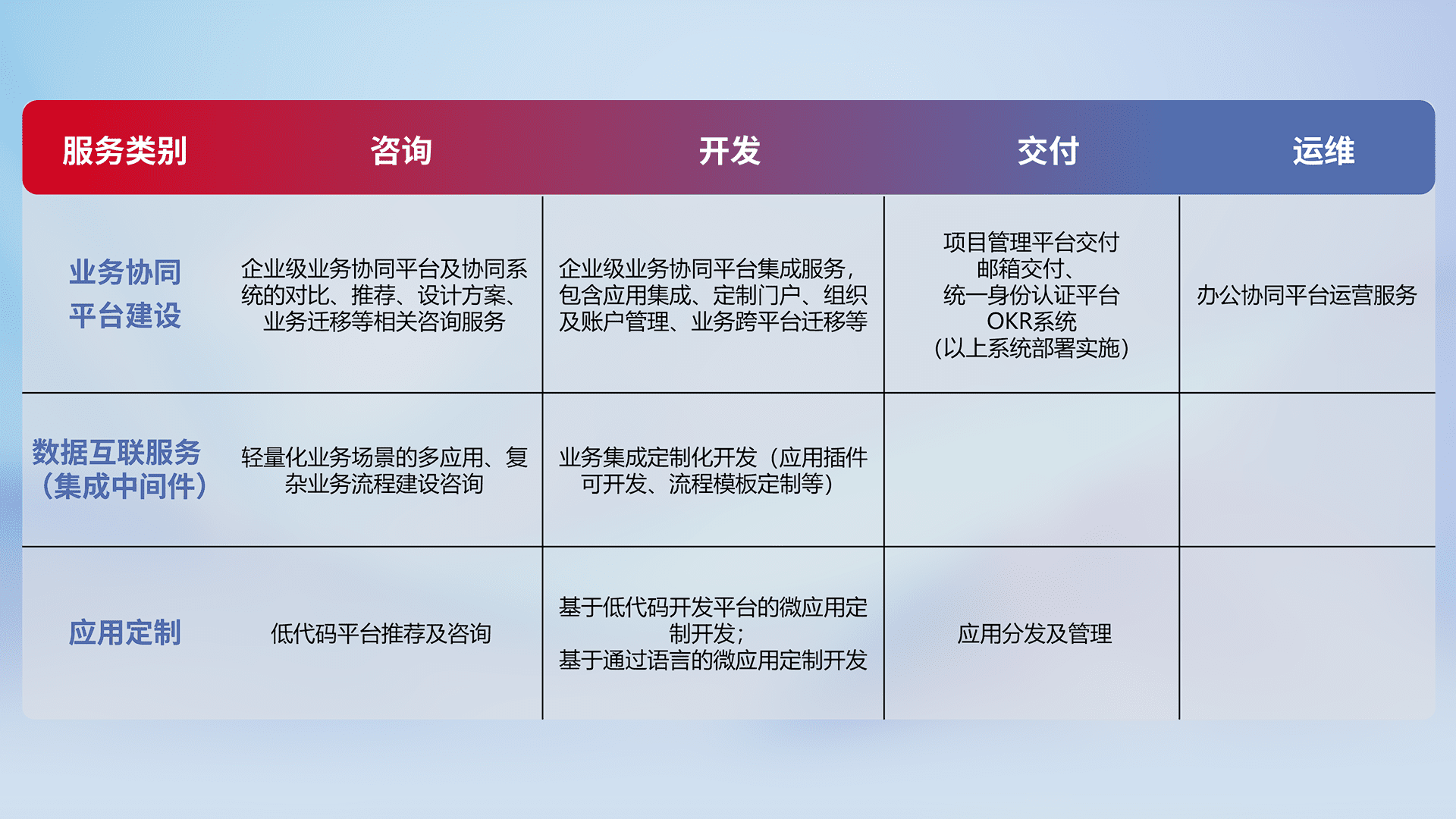 针对钉钉、、、、企微、、、IDaas等平台级产品提供产品的规划、、方案、、、交付、、、定制化开发等服务,,实现如统一协同办公、、、智能客户服务、、、、混合会议管理、、、、智能数据查询、、等业务场景,,实现数字化转型。。